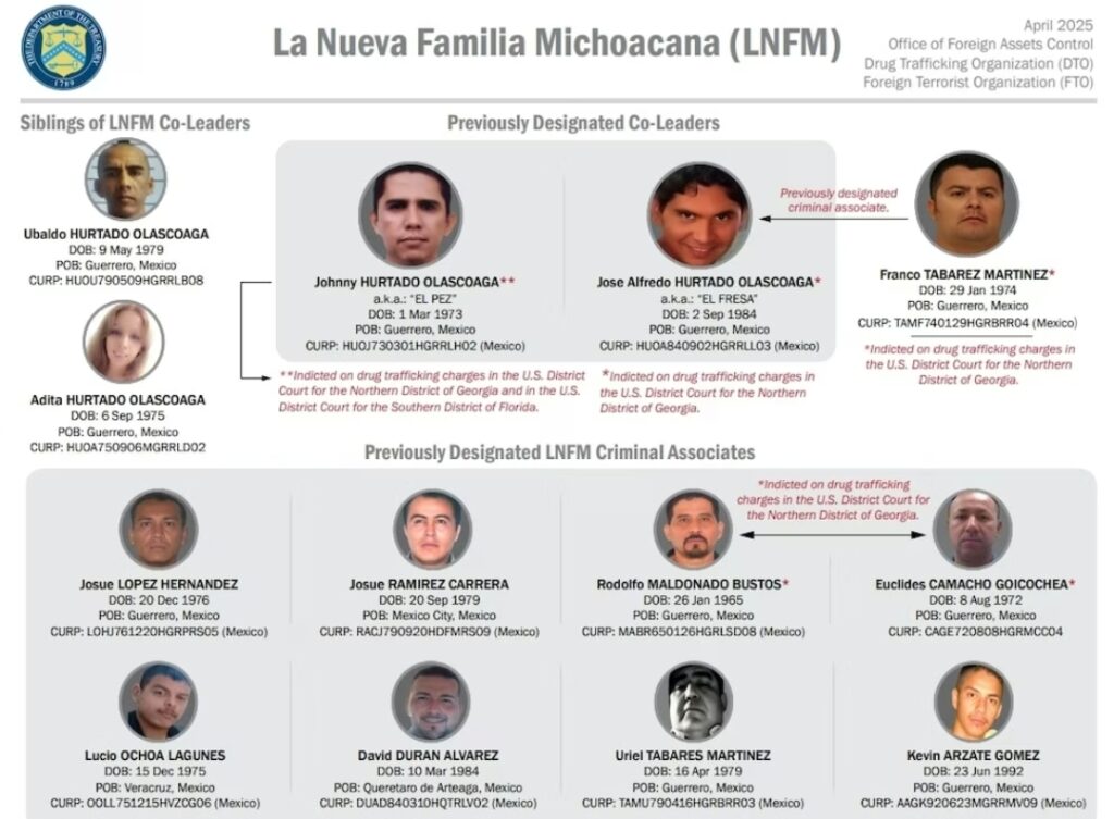 La Oficina de Control de Activos Extranjeros (OFAC) del Departamento del Tesoro de EE.UU. sancionó a cuatro personas vinculadas al cártel mexicano La Nueva Familia Michoacana, que fue considerada terrorista por la Administración de Donald Trump.