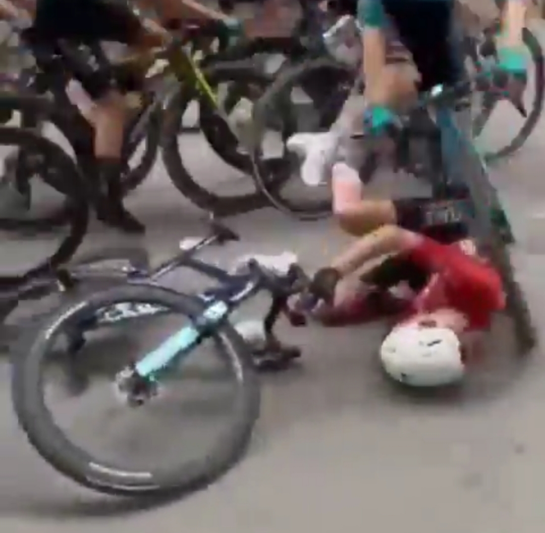 Una espectadora perdió el equilibrio en la acera y cayó en el pelotón, derribando a la ciclista neerlandesa Aniek van Alphen durante la tercera etapa de la Vuelta femenina a España, disputada ayer martes 6 de mayo del 2025 en Barbastro (Aragón, España).