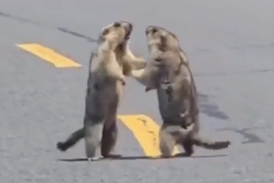 En la Red se ha viralizado un video en el que dos marmotas luchan erguidas sobre sus patas traseras en medio de una carretera de China, lo que detuvo el tráfico.
