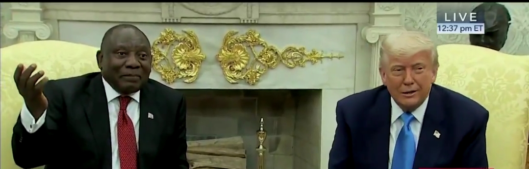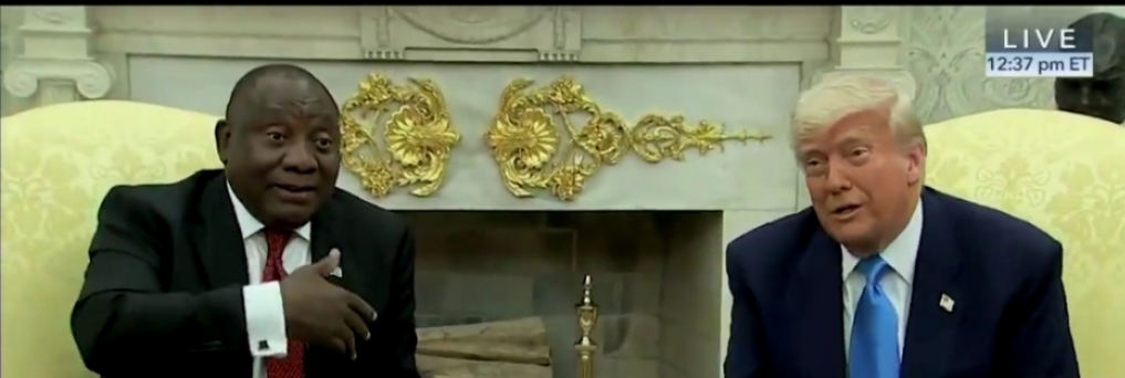 El presidente de EE.UU., Donald Trump, tendió una emboscada hoy miércoles 21 de mayo del 2025 a su homólogo de Sudáfrica, Cyril Ramaphosa, con un video incluido, en el cual supuestamente mostraba evidencia de un ‘genocidio’ de personas blancas en el país africano.