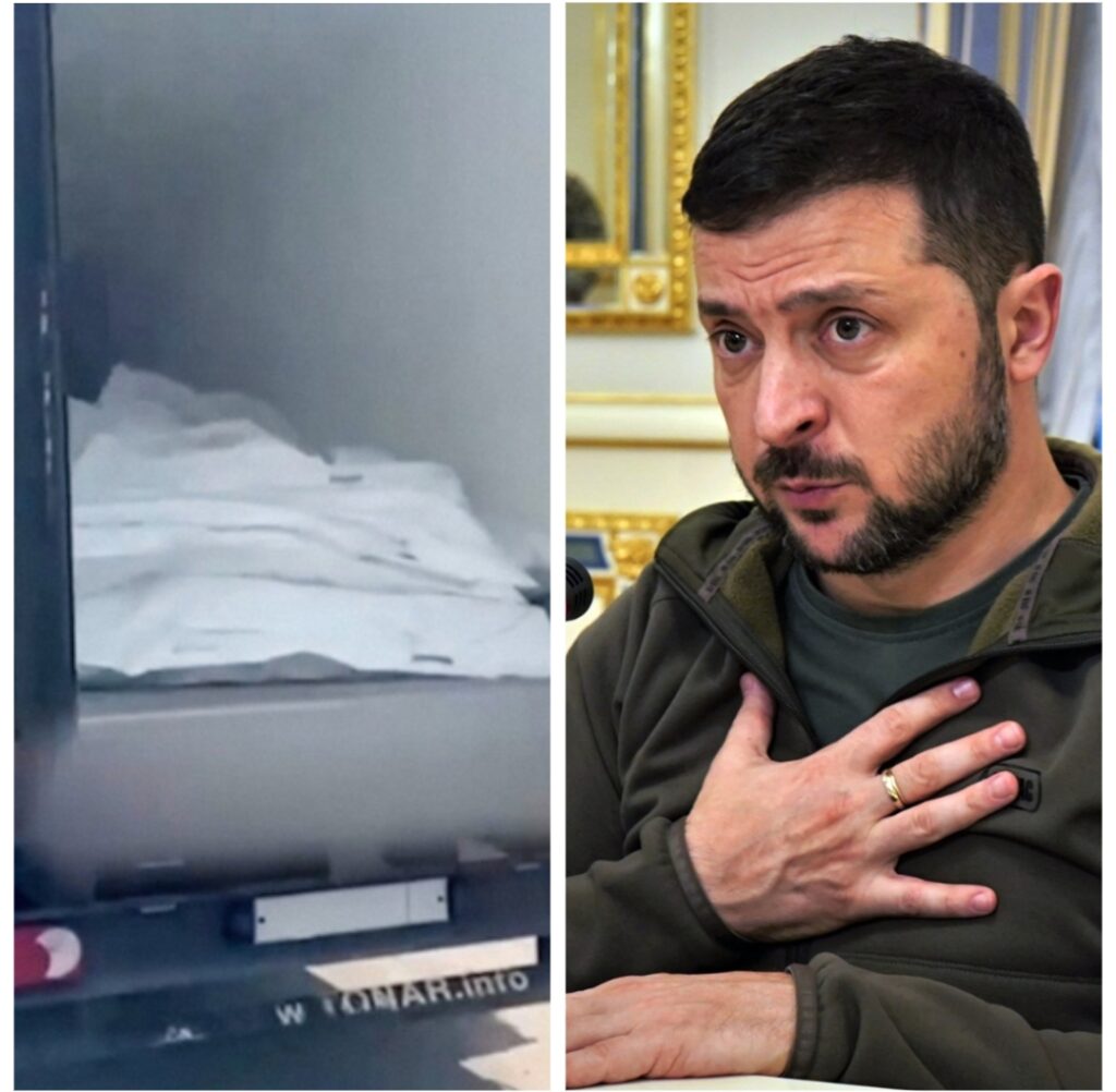 Cuerpos de soldados ucranianos fallecidos y Zelenski