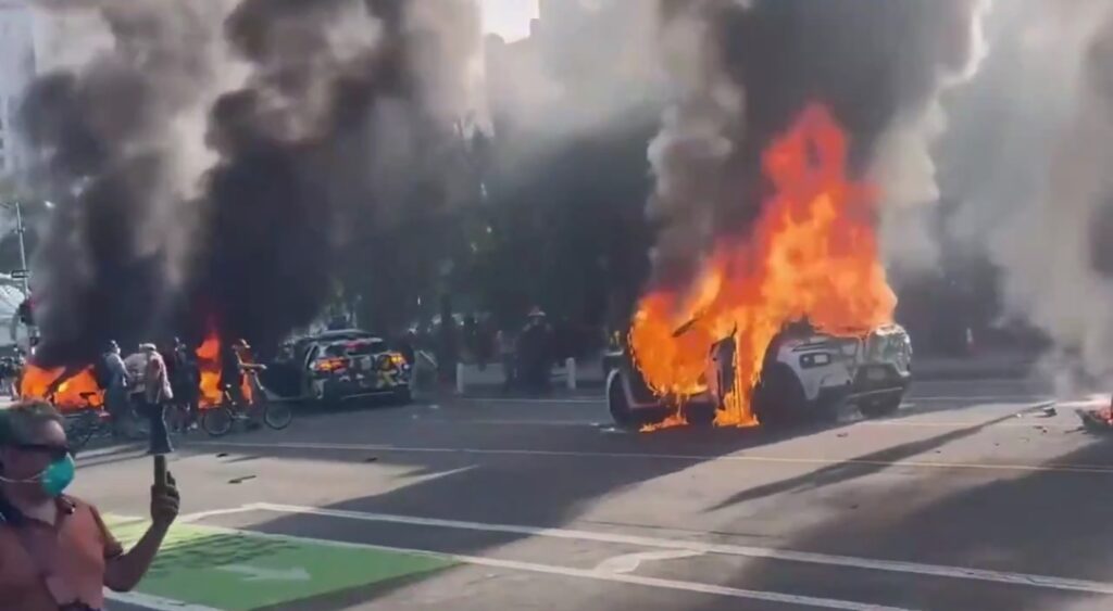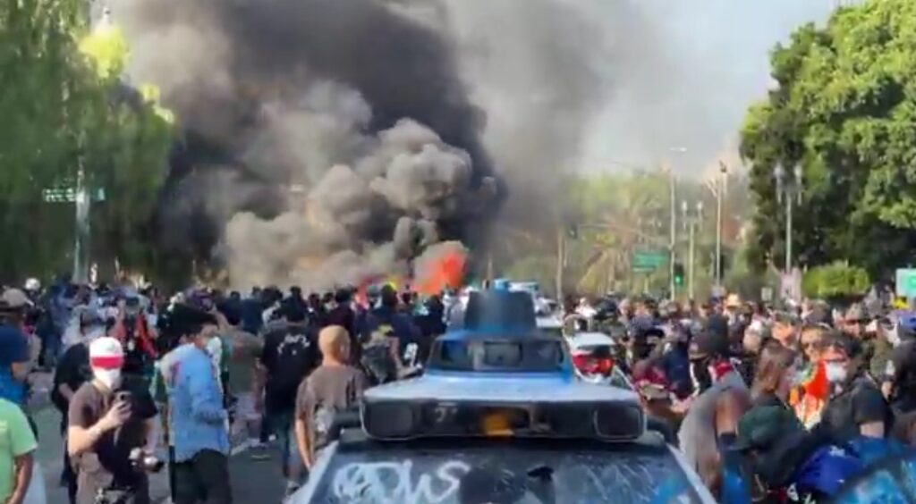En las imágenes desde el lugar se observa cómo los participantes en los disturbios quemaron numerosos automóviles. Se reportan casos de vandalismo y saqueos.