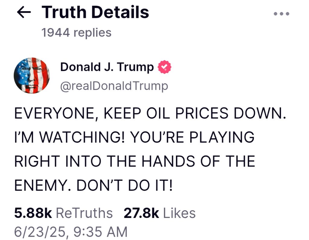 “¡Todos mantengan bajos los precios del petróleo! ¡Los estoy vigilando!“, advirtió Trump, agregando que no hacerlo significaría caer en manos del enemigo. “¡No lo hagan!“, concluyó.