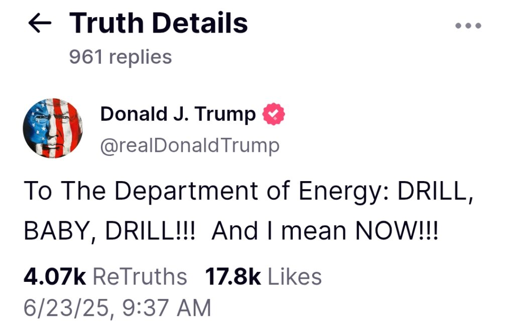 Inmediatamente después, publicó otro mensaje, esta vez dirigido al Departamento de Energía estadounidense, exhortando a aumentar la extracción de crudo. “Al Departamento de Energía: ¡Perforen, chicos, perforen! ¡Y digo ahora!“, escribió.