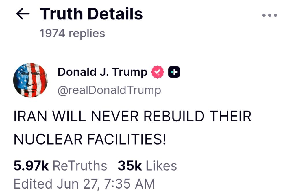 “¡Irán nunca reconstruirá sus instalaciones nucleares!“, prometió este martes. De acuerdo con sus palabras, el programa nuclear de Irán “ha sufrido un retroceso de varios años, básicamente, de décadas”.