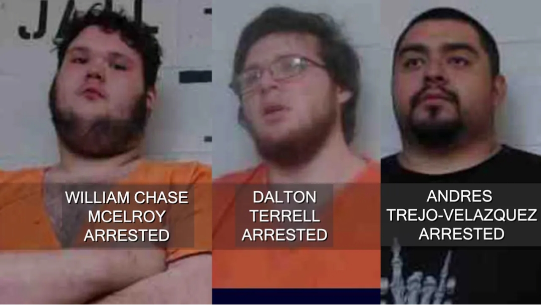 William McElroy, de 21 años de edad, Dalton Terrell, de 21 de edad, y Andrés Trejo-Velázquez, de 29 de edad, fueron imputados el pasado 11 de julio del 2025 por cargos de violación, sodomía y trata de personas que involucran a seis menores de edad. La víctima más joven tenía 3 años de edad, según Jones.