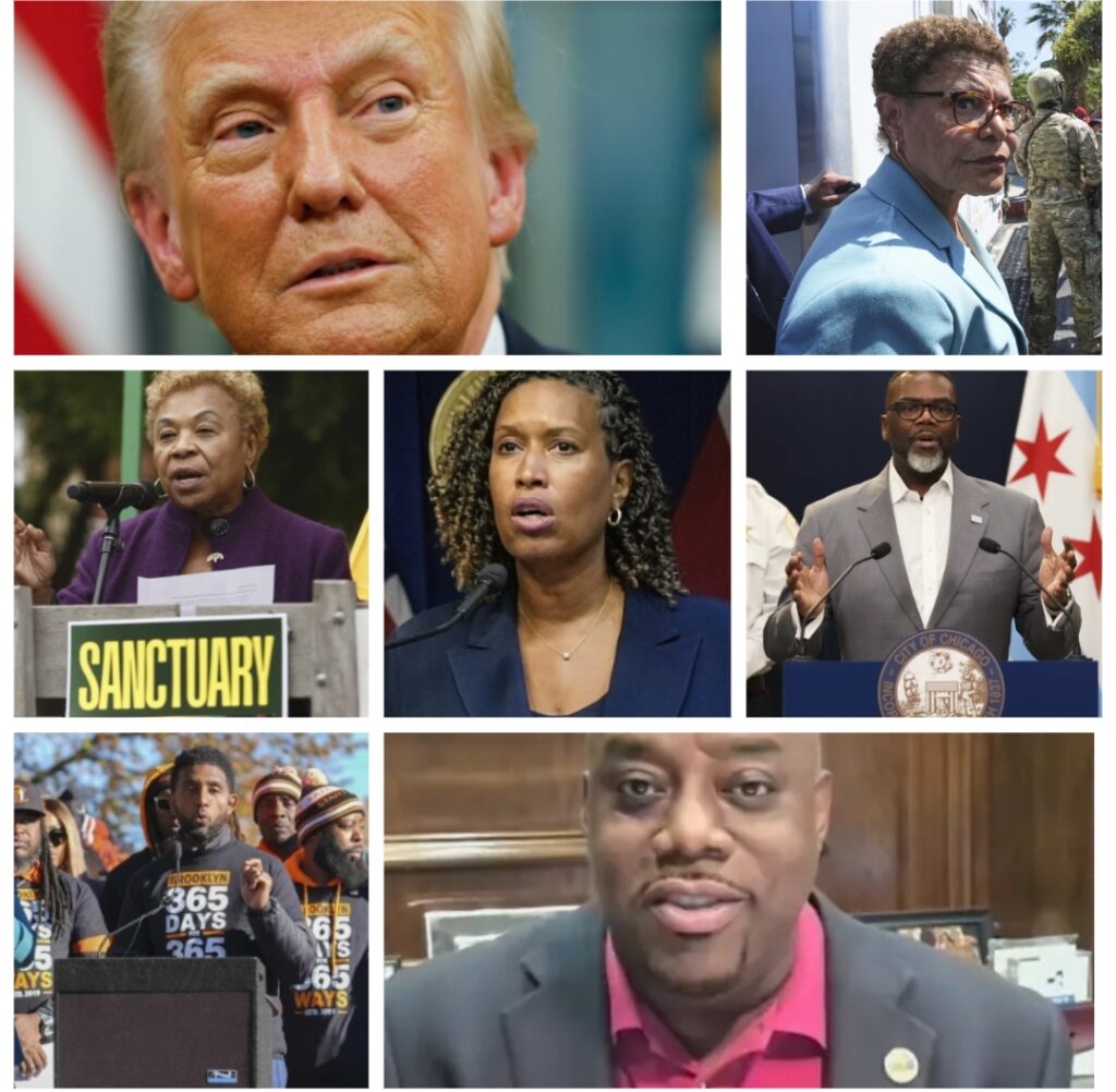 Donald Trump, Karen Bass, Bárbara Lee, Muriel Bowser, Brandon Johnson, Brandon Scott, y Van Johnson