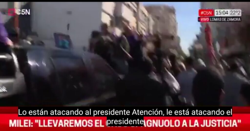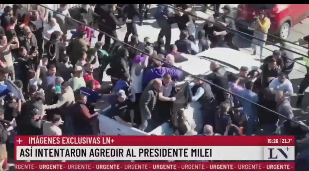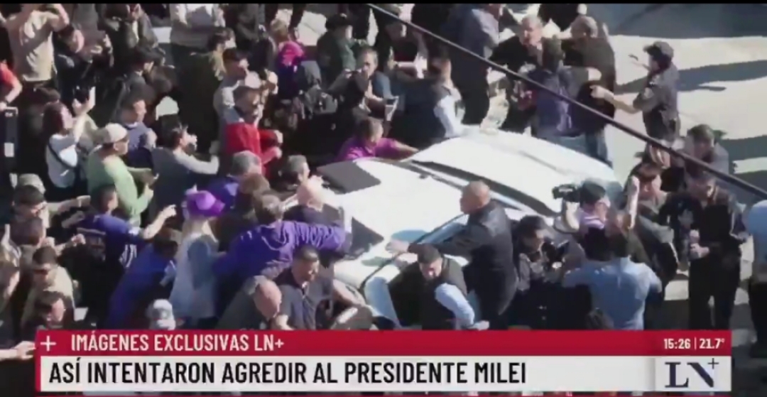 El presidente de Argentina, Javier Milei, tuvo que ser evacuado hoy miércoles 27 de agosto del 2025 en la provincia de Buenos Aires por incidentes con personas que arrojaron objetos contra la camioneta descubierta en la que viajaba.