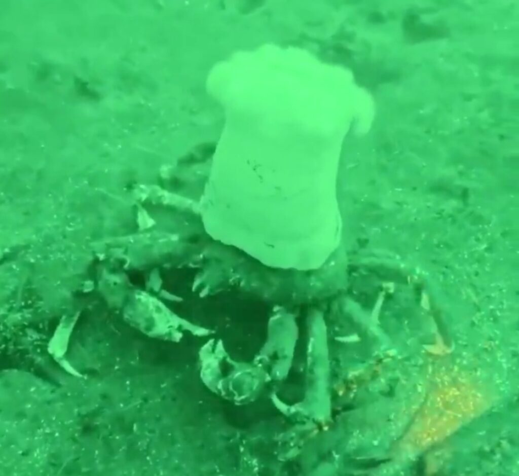 En la Red se ha viralizado un video en el que un cangrejo pasea por el fondo marino con una anémona en la cabeza, que se asemeja a un sombrero de cocinero.