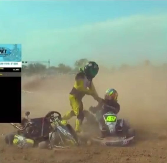 En las imágenes se observa cómo, tras un roce al final de una recta, los karts de dos de los corredores se desvían y terminan en la tierra que delimita el circuito