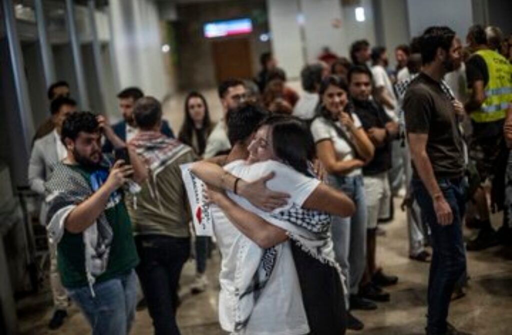 Un primer grupo de españoles detenidos por Israel mientras viajaban hacia Gaza a bordo de la Flotilla de la Libertad regresó a Madrid la tarde de ayer domingo 5 de octubre del 2025.