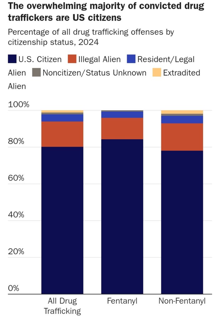 Los estadounidenses fueron el 80,11 % de los condenados por todo tipo de tráfico de droga, el 84,28 % de los que lo fueron por traficar con fentanilo y el 77,99 % de los que lo hicieron con drogas distintas al fentanilo.
