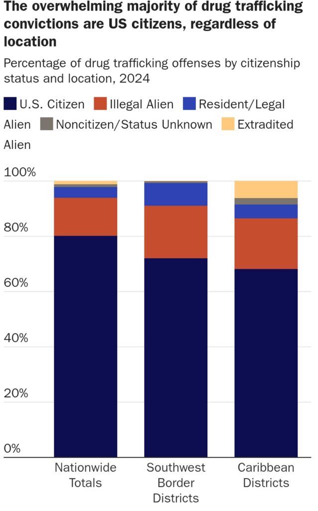 Es en esa zona donde más hincapié hacen los mensajes políticos que hablan de la inundación de drogas del país por parte de los inmigrantes vinculados a los cárteles extranjeros. Allí los ciudadanos estadounidenses representan el 72 % de los condenados.