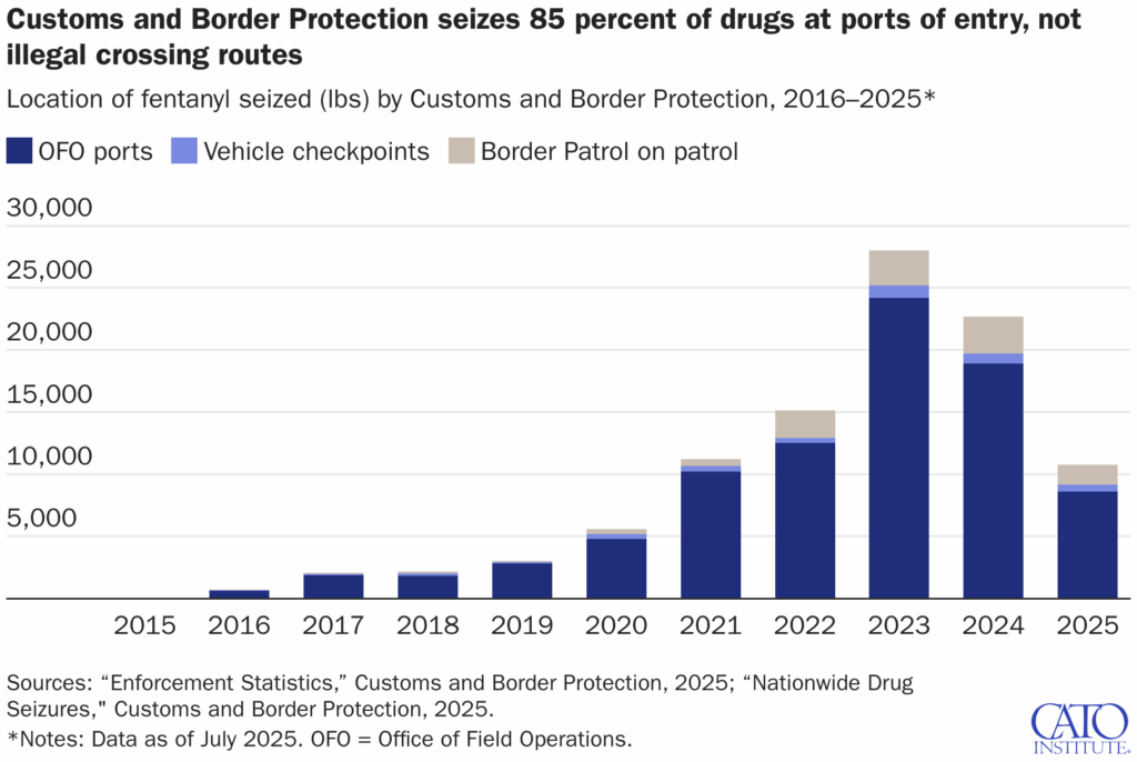 Es por ello que la mayor cantidad de fentanilo se incauta en los puertos de entrada legales. Entre 2015 y 2025 tan solo el 4 % se incautó en controles vehiculares en las carreteras después de los puertos y el 11 % durante las rondas de la Patrulla Fronteriza.
