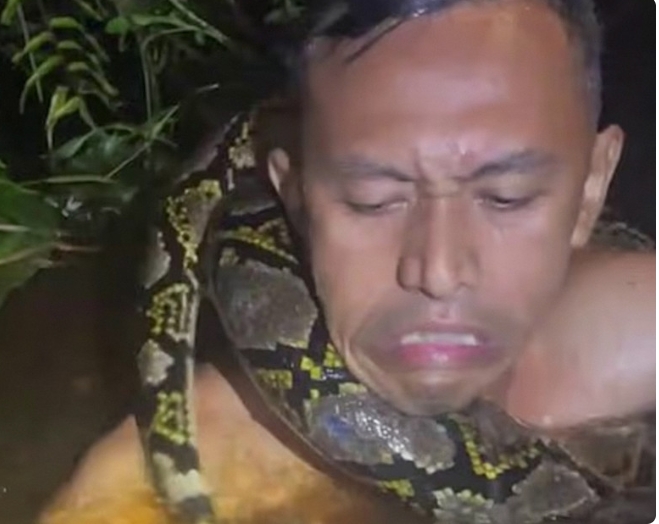 Una pitón de seis metros se enroscó alrededor del cuello de un guía turístico mientras realizaba una captura en un pantano en Borneo, Indonesia.