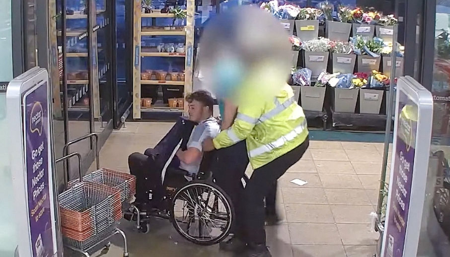 De acuerdo a la Policía, el individuo ingresó al local en una silla de ruedas con la ayuda de un cómplice de 17 años de edad e intentó ocultar sobre sus piernas un par de cajas de cerveza que cubrió con una chaqueta.