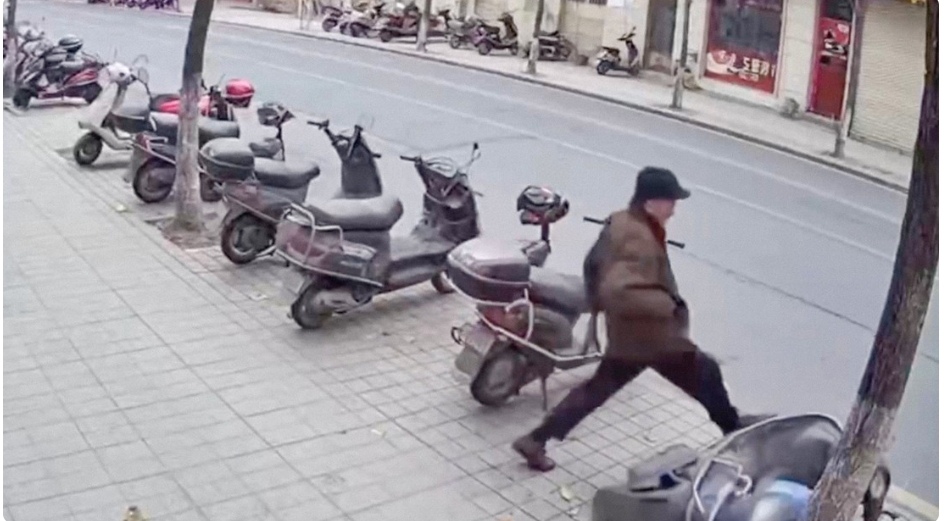 Las cámaras de seguridad de una calle en China captaron el momento en el que un anciano visiblemente molesto pateó una motocicleta que se encontraba estacionada al lado de varias otras.