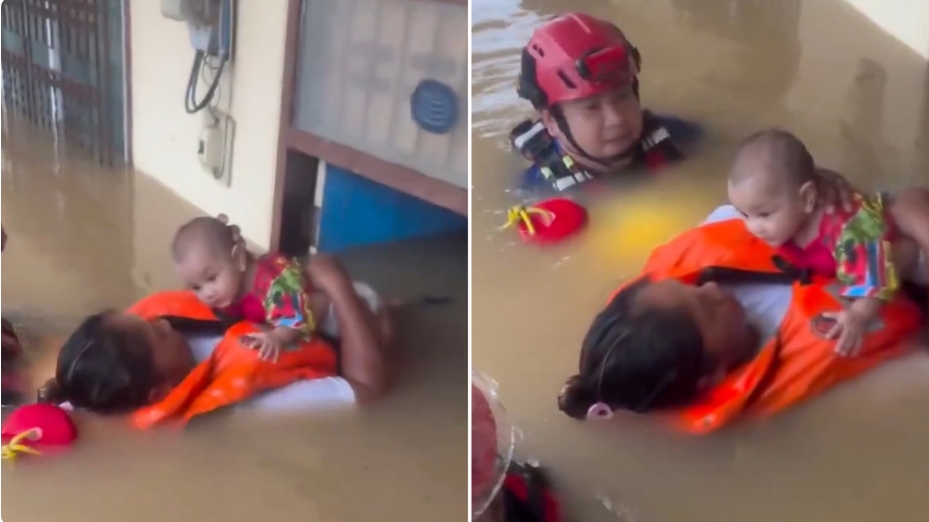 En medio de la emergencia, se registró en video el rescate de una mujer que sostenía a un bebé sobre su pecho mientras salía de un edificio inundado.