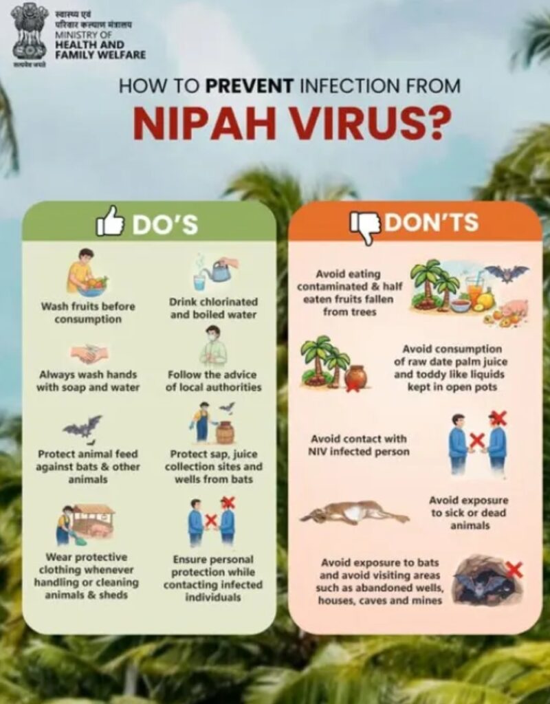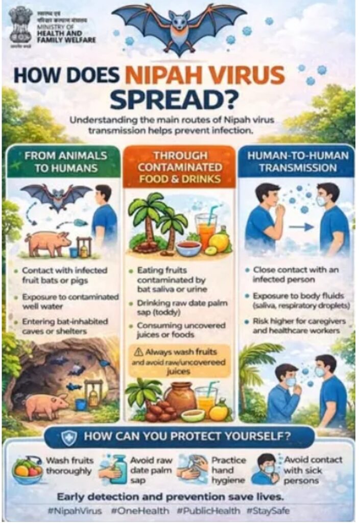 El virus Nipah es transmitido principalmente por murciélagos frugívoros, contacto con alimentos contaminados o, con menor frecuencia, a través del contacto cercano con individuos infectados. Es considerado por la Organización Mundial de la Salud como un patógeno de alta prioridad debido a su elevada letalidad y capacidad de causar brotes graves. Actualmente no existe vacuna ni tratamiento antiviral específico.