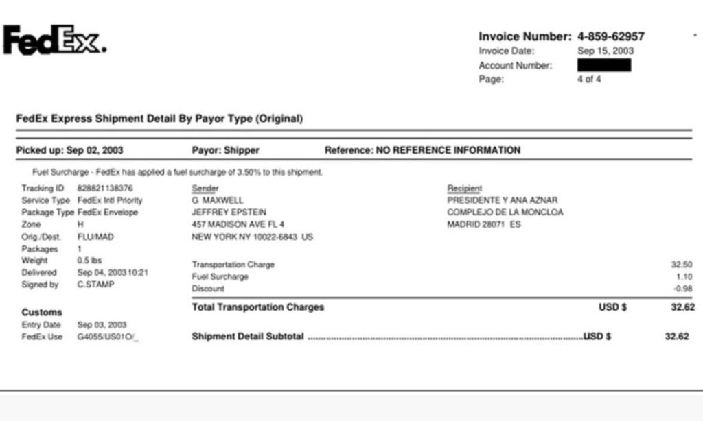 Recibo del envío, José María Aznar y Jeffrey Epstein