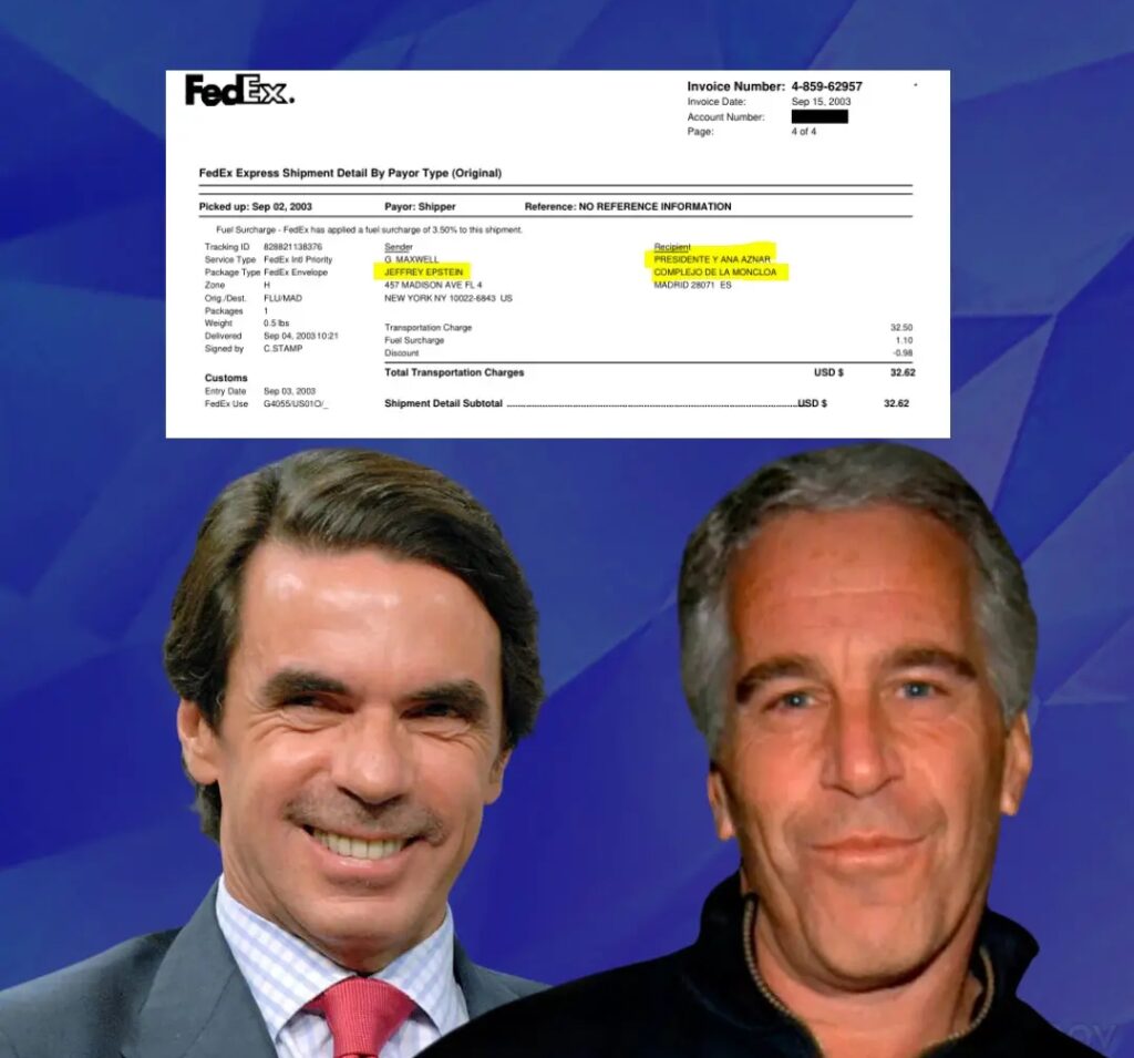 Los nuevos archivos del fallecido delincuente sexual Jeffrey Epstein, que incluyen 2.000 videos y 180.000 imágenes relacionadas con el caso, exponen recibos de dos envíos de paquetes dirigidos al expresidente del Gobierno español José María Aznar.