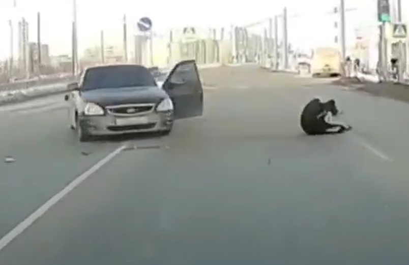 Un conductor en la ciudad rusa de Omsk salió catapultado de su vehículo tras sufrir un choque al intentar incorporarse a una vía.