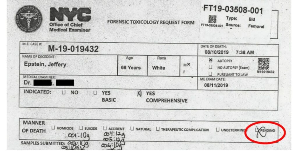 Documento del forense sobre la muerte de Jeffrey Epstein que dice “pendiente”