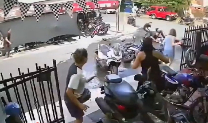Una cámara de seguridad registró el momento en que un presunto sicario llegó en moto a un local del barrio Pedregal, en la ciudad de Medellín, Colombia y habría intentado sacar un arma.