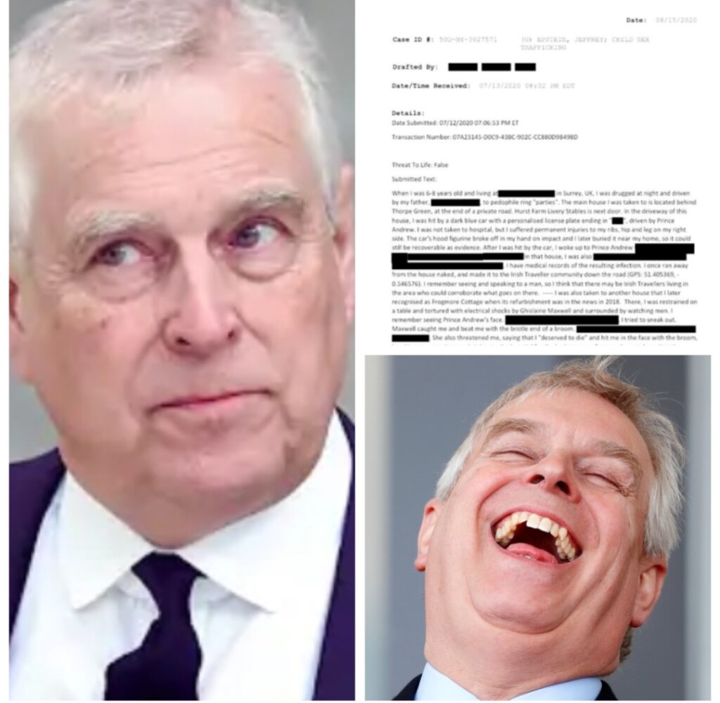 “Cuando tenía entre 6 y 8 años de edad y vivía en Surrey, Reino Unido, mi padre me drogaba por la noche y me llevaba a fiestas de bandas de pederastas”, afirmó la supuesta víctima en su denuncia. Asimismo, señaló que en uno de aquellos eventos fue atropellada por “un coche azul oscuro con matrícula personalizada terminada en ‘M’, conducido por el wxpríncipe Andrés“.